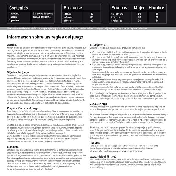 Intimate Mission takes you on a journey of discovery, where the most important thing is to enjoy yourself. Through 480 questions and activities, you and your partner will discover what you like most. The game begins with affectionate and romantic tests, then moves on to more intimate activities, finally reaching the most passionate tests where everything is allowed and nothing is obligatory. In a playful way, barriers are broken down and you grow closer to each other. The game is captivating, exciting, direct, and daring, sometimes hilarious, but without ever losing respect and good taste. In this game, there are no obligations, and everything can be done to everyone's liking.