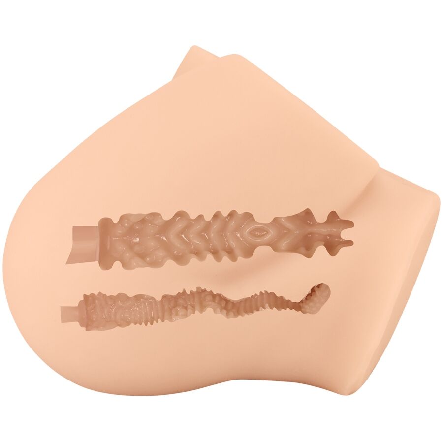 Agarra, aprieta, acaricia y azota este masturbador de trasero y vagina realista. Este juguete sexual súper ajustado de dos orificios brinda la experiencia perfecta y llena de placer. Deslízate profundamente dentro del culo apretado y el coño realista mientras te deslizas dentro de su túnel de textura intrincada. Las estrías finas y las protuberancias estimulantes rodean tu pene mientras acaricias de un lado a otro. Su coño apretado y su culo de melocotón están esperando ser llenados, para una noche tras otra de satisfacción