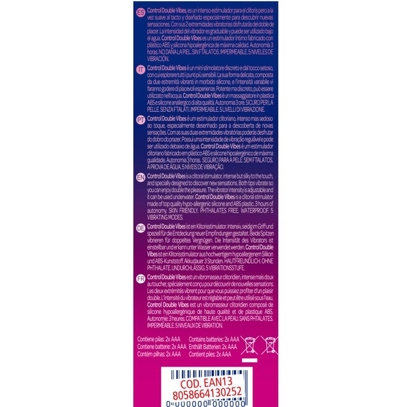 Grâce à ses deux embouts vibrants, vous profiterez d'un plaisir double. L'intensité du vibromasseur est réglable et peut être utilisé sous l'eau. Control Double Vibes est un stimulateur intime fabriqué en plastique ABS de qualité supérieure et en silicone hypoallergénique.