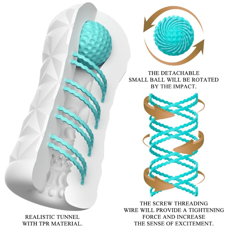 Un petit outil pour une masturbation intense ! Ce masturbateur transparent et réutilisable est doté d'une spirale rotative et d'une bille de stimulation latérale. La spirale rotative fait tourner le masturbateur pendant la pénétration, tandis que la bille supérieure stimule le point idéal et vous procure une sensation inédite. Le manchon présente une texture stimulante et excitante qui masse le pénis intensément et dynamiquement pendant les rapports sexuels. Vous pouvez utiliser ce masturbateur élégant et doux pour la peau à l'infini. Très facile à utiliser, un pur plaisir !